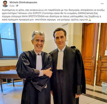 «Αγαπημένες-οι φίλοι, σας ανακοινώνω ότι παράλληλα με την δικηγορία, αποφάσισα να ανοίξω φροντιστήριο Γαλλικών στο ΚΟΡΩΠΙ (Corrompu-e)και θα το ονομάσω ΖΑΜΑΙ(Jamais).Σας εύχομαι ολόψυχα ΚΑΛΑ ΧΡΙΣΤΟΥΓΕΝΝΑ και ιδιαίτερα σε όσους γαλλομαθείς της Σορβόννης η κακή πράγματι προφορά μου αποτέλεσε αφορμή για χιούμορ, σχόλια, ειρωνεία» έγραψε στο Facebook ο Μιχάλης Δημητρακόπουλος.