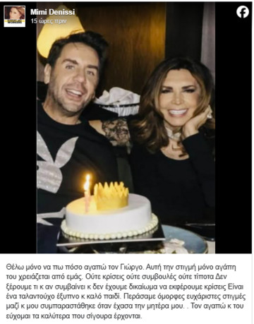 «Θέλω μόνο να πω πόσο αγαπώ τον Γιώργο. Αυτή την στιγμή μόνο αγάπη του χρειάζεται από εμάς. Ούτε κρίσεις ούτε συμβουλές ούτε τίποτα. Δεν ξέρουμε τι και αν συμβαίνει και δεν έχουμε δικαίωμα να εκφέρουμε κρίσεις. Είναι ένα ταλαντούχο έξυπνο και καλό παιδί. Περάσαμε όμορφες ευχάριστες στιγμές μαζί και μου συμπαραστάθηκε όταν έχασα την μητέρα μου. Τον αγαπώ και του εύχομαι τα καλύτερα που σίγουρα έρχονται», έγραψε η Μιμή Ντενίση.