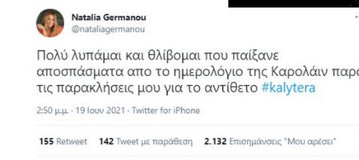 Την αντίρρησή της που στο «Καλύτερα δε γίνεται» προβλήθηκαν αποσπάσματα από το ημερολόγιο της άτυχης Καρολάιν, που δολοφονήθηκε από τον σύζυγό της εξέφρασε μέσω Twitter η Nαταλία Γερμανού, ζητώντας με το τρόπο της “συγνώμη” αφού δεν ακούστηκε η επιθυμία της.