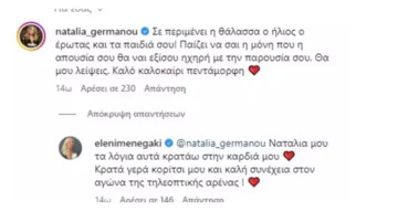 «Σε περιμένει η θάλασσα ο ήλιος ο έρωτας και τα παιδιά σου! Παίζει να σαι η μόνη που η απουσία σου θα ναι εξίσου ηχηρή με την παρουσία σου. Θα μου λείψεις. Καλό καλοκαίρι πεντάμορφη» σχολίασε χαρακτηριστικά η Ναταλία Γερμανού με την Ελένη Μενεγάκη να της απαντά, «Ναταλία μου τα λόγια αυτά κρατάω στην καρδιά μου Κρατά γερά κορίτσι μου και καλή συνέχεια στον αγώνα της τηλεοπτικής αρένας!».