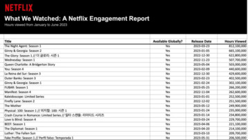 Πρώτη έρχεται η σειρά «The Night Agent», η οποία σημείωσε 812.000.000 ώρες τηλεθέασης από τον Ιανουάριο έως τον Ιούνιο του 2023. Ακολουθεί το «Ginny & Georgia, με 655.100.000 ώρες και στη συνέχεια, βρίσκονται τα «The Glory» με 622.800.000 ώρες, το «Wednesday» με 507.700.000 ώρες και τελευταία στη πεντάδα είναι η σειρά «Queen Charlotte: A Bridgerton Story» με 503.000.000 ώρες τηλεθέασης.