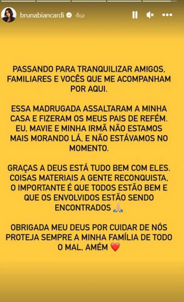 «Για να καθησυχάσω τους φίλους, την οικογένεια και όσους από εσάς με ακολουθείτε, σας ενημερώνω ότι σήμερα το πρωί έγινε ληστεία στο σπίτι μου και οι γονείς μου πιάστηκαν όμηροι. Εγώ, η Mavie και η αδερφή μου δεν μένουμε πλέον εκεί, ούτε βρισκόμασταν εκείνη τη στιγμή στο σπίτι», έγραψε η Μπιανκάρντι στα μέσα κοινωνικής δικτύωσης και συμπλήρωσε: «Δόξα τω Θεώ, όλοι είμαστε καλά. Το σημαντικό είναι ότι όλοι είναι καλά στην υγεία τους και ότι οι δράστες έχουν βρεθεί. Ευχαριστούμε τον Θεό που μας προσέχει και προσεύχομαι για να προστατεύει πάντα την οικογένειά μου από κάθε κακό».