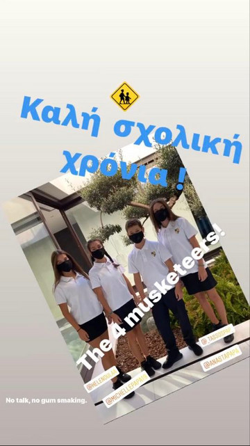 Η σύζυγος του Προέδρου του ΔΗΚΟ απαθανάτισε μια φωτογραφία με τα παιδιά της, λίγο πριν αναχωρήσουν για το σχολείο και την ανάρτησε μέσα από τον προσωπικό της λογαριασμό στο Instagram. Η ίδια τους ευχήθηκε “Καλή σχολική χρονιά” και έκανε και ένα χιουμοριστικό σχόλιο για το γεγονός πως φορούσαν και οι 4 μάσκες, γράφοντας: