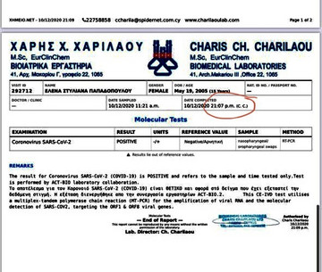 Στην ανακοίνωση, ο Νικόλας Παπαδόπουλος παραθέτει επίσης φωτογραφία από τα αποτελέσματα της εργαστηριακής εξέτασης της κόρης του.