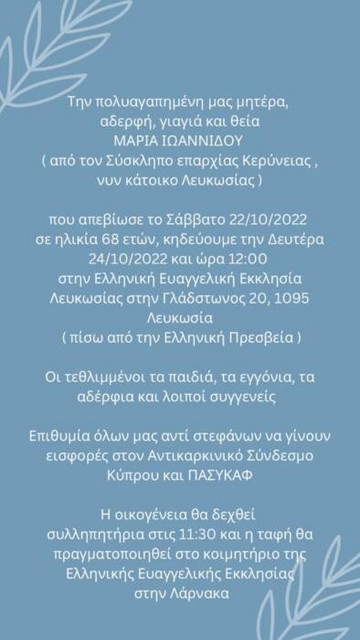 Η κηδεία της Μαρίας Ιωαννίδη, θα πραγματοποιηθεί αύριο Δευτέρα 24/10 στις 12 το μεσημέρι στην Ευαγγελική εκκλησία της Λευκωσίας και επιθυμία της οικογένειας, η οποία συγκίνησε με την πράξη της είναι αντί στεφάνων να γίνουν εισφορές στον Αντικαρκινικό Σύνδεσμο Κύπρου και ΠΑΣΥΚΑΦ.