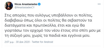Mε τη σύζυγο του Άντρη και χωρίς τα παιδιά και τα εγγόνια του θα υποδεχθεί τη νέα χρονιά 2021 ο Πρόεδρος της Δημοκρατίας Νίκος Αναστασιάδης. Σε ανάρτηση του στο twitter, ξεκαθαρίζει ότι: