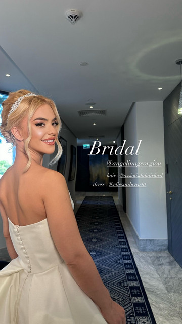 Η νύφη για την πιο σημαντική μέρα της ζωής της, επέλεξε να φορέσει δημιουργία του γνωστού οίκου Elie Saab. Συγκεκριμένα η Αγγελίνα Γεωργίου επέλεξε ένα πριγκιπικό, crepe νυφικό σε λευκό χρώμα. Το wedding look της ολοκλήρωναν ψηλά γάντια, μακρύ πέπλο και ένα εντυπωσιακό headband.