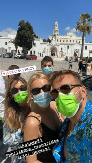 Ειδικότερα, ο Νίκος Κοκλώνης κοινοποίησε πρόσφατα στον προσωπικό του λογαριασμό στο instagram μία φωτογραφία τους από την Τήνο. Στο στιγμιότυπο βλέπουμε τον Νίκο Κοκλώνη και την Κατερίνα Καινούργιου μαζί με τον Φίλιππο Τσαγκρίδη και την Πηγή Δεβετζή. Όλοι τους απόλαυσαν την βόλτα τους στην Παναγια της Τήνου, φορώντας τις μάσκες προστασίας τους.