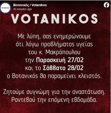 «Με λύπη, σας ενημερώνουμε ότι λόγω προβλήματος υγείας του κ. Μακρόπουλου την Παρασκευή 27/02 και το Σάββατο 28/02, ο Βοτανικός θα παραμείνει κλειστός» αναφέρεται στο post του νυχτερινού καταστήματος στο facebook.
