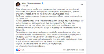 Ο Νίκος Οικονομόπουλος έπειτα από τέσσερις ημέρες νοσηλείας στον Ευαγγελισμό λόγω covid-19, πήρε εξιτήριο και έκανε την πρώτη του ανάρτηση στο facebook.
