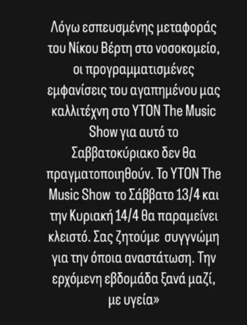 «Καλημέρα σε όλους. Ο Νίκος Βέρτης είναι καλύτερα. Η τροφική δηλητηρίαση που τον εξάντλησε χθες τόσο έντονα έχει μια σταθερή βελτίωση, με τη βοήθεια της άψογης νοσοκομειακής περίθαλψης σε 2-3 μέρες θα είναι και πάλι καλά. Ευχαριστούμε πολύ για το ενδιαφέρον και τα θερμά μηνύματα συμπαράστασης όλων σας» αναφέρει η σχετική ανακοίνωση.