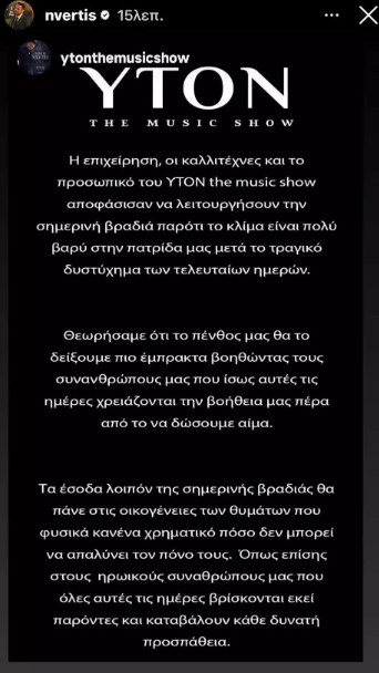 Όλα τα έσοδα της βραδιάς θα πάνε σε αυτόν τον καλό σκοπό που θα διαβάσετε στα social media. Γενικά, δεν είναι σωστό να λες όταν κάνεις ένα καλό. Είναι λάθος. Όμως, σε αυτή την περίπτωση, έπρεπε να το πούμε γιατί διαφορετικά θα γινόταν χαμός, καταλαβαίνετε. Το πιο εύκολο πράγμα για εμάς θα ήταν να κάτσουμε σπίτι μας. Πόσω μάλλον για εμένα που ήμουν και άρρωστος αυτές τις μέρες αλλά ήταν μεγαλύτερή μου χαρά να συνεισφέρω στο ελάχιστο, αν μπορώ» ήταν τα λόγια του τραγουδιστή κατά την εμφάνισή του στην πίστα το βράδυ του περασμένου Σαββάτου.