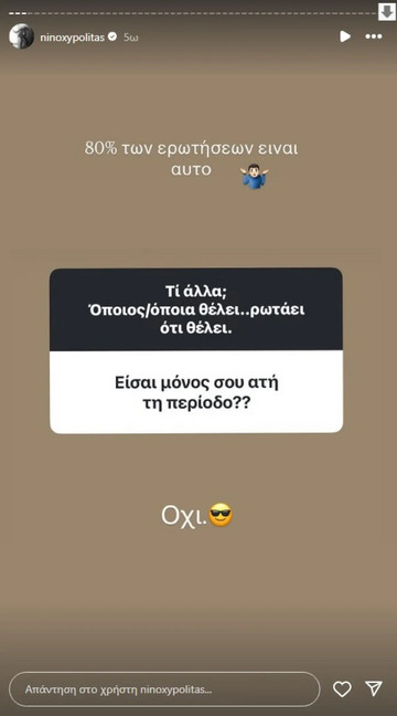 Μέσα από ένα πρόσφατο Q&A που έκανε με τους διαδικτυακούς του φίλους στο Instagram, αποκάλυψε ότι δεν είναι πια μόνος. Συγκεκριμένα, απαντώντας σε ερώτηση follower για το αν είναι σε σχέση, έγραψε: «Το 80% των ερωτήσεων είναι αυτό! Όχι!», δίνοντας με αυτόν τον τρόπο μια ξεκάθαρη απάντηση.