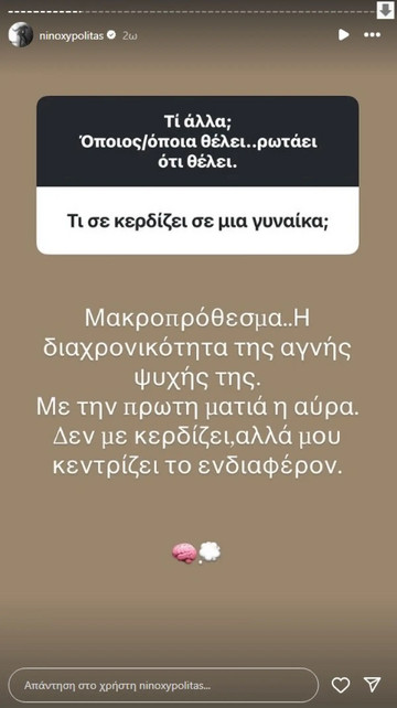 Δεν έμεινε όμως εκεί! Ο Νίνο μοιράστηκε και τι είναι αυτό που τον κερδίζει σε μια γυναίκα: «Μακροπρόθεσμα… η διαχρονικότητα της αγνής ψυχής της. Με την πρώτη ματιά, η αύρα. Δεν με κερδίζει αλλά μου κεντρίζει το ενδιαφέρον».