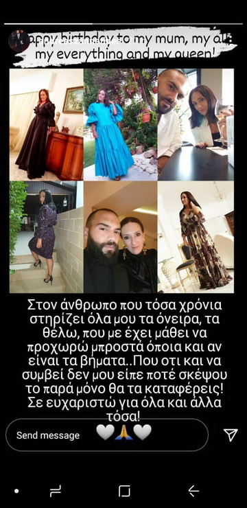 “Χρόνια πολλά στη μητέρα μου, στα πάντα μου όλα, στη βασίλισσα μου”. Ενώ συνέχισε προσθέτοντας: “ Στον άνθρωπο που τόσα χρόνια στηρίζει όλα μου τα όνειρα, τα θέλω, που με έχει μάθει να προχωράω μπροστά, όποια και αν είναι τα βήματα. Που ότι και να συμβεί δεν μου είπε ποτέ σκέψου το παρά μόνο θα τα καταφέρεις.. Σε ευχαριστώ για όλα και για άλλα τόσα”