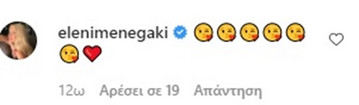 Η Ελένη Μενεγάκη, η οποία ακολουθεί την αδυναμία της και βλέπει το τι ανεβάζει στη δημοφιλή πλατφόρμα, μόλις αντίκρισε στο feed της την εν λόγω φωτογραφία θέλησε εκτός από like, να αφήσει και σχόλιο. Η ίδια εναπόθεσε emoji που στέλνουν φιλάκια και καρδιές, δείχνοντας “έτσι” ότι αποδέχεται την σχέση τους!