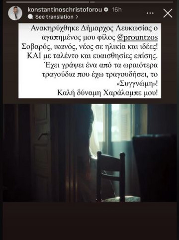 Ο αγαπημένος τραγουδιστής Κωνσταντίνος Χριστοφόρου μέσα από μια ανάρτησή του στον προσωπικό του λογαριασμό στο Instagram, εξέφρασε δημόσια τα συγχαρητήρια του και την εκτίμησή στον Χαράλαμπο Προύντζο, ο οποίος εξελέγη Δήμαρχος Λευκωσίας.