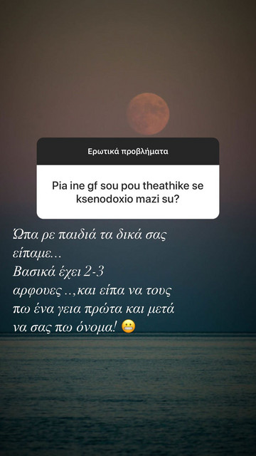 Ανάμεσα στις ερωτήσεις που δέχτηκε φυσικά, ήταν και μια που αφορούσε την δική του προσωπική ζωή και την νέα σύντροφό του, με την οποία εθεάθησαν πρόσφατα μαζί σε ξενοδοχείο της Αγίας Νάπας, Ο ίδιος δεν δίστασε και απάντησε, αποκαλύπτοντας πως θέλει να κρατήσει για ακόμη λίγο καιρό “κρυφό” το όνομα, αφού η αγαπημένη του έχει 2-3 αδέρφια.