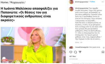 Μέσα από τον προσωπικό του λογαριασμό στο Instagram θέλησε να απαντήσει ο Δημήτρης Παπανώτας στα όσα δήλωσε η Ιωάννα Μαλέσκου για τον ίδιο, μέσα από την εκπομπή της ”Love it”. Θυμίζουμε ότι η παρουσιάστρια θέλησε να σχολιάσει τις δηλώσεις που έκανε ο Παπανώτας για την Μαρία Σολωμού και την ηλικία της.