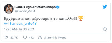 O πρωταθλητής ΝΒΑ 2021 με τα «ελάφια» και ΜVP των τελικών έγραψε συγκεκριμένα στα ελληνικά στον προσωπικό λογαριασμό του στο Τwitter: «Ερχόμαστε και φέρνουμε και το Κύπελλο!».