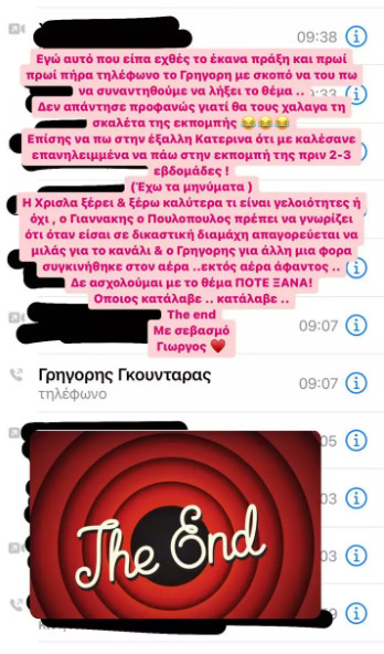 «Εγώ αυτό που είπα εχθές, το έκανα πράξη και πρωί πρωί πήρα τηλέφωνο τον Γρηγόρη με σκοπό να συναντηθούμε να λήξει το θέμα… Δεν απάντησε προφανώς γιατί θα τους χάλαγα τη σκαλέτα της εκπομπής. Επίσης να πω στην έξαλλη Κατερίνα ότι με καλέσανε επανειλημμένα να πάω στην εκπομπή της πριν 2-3 εβδομάδες! (έχω τα μηνύματα).