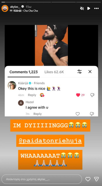 Στη συνέχεια, ο τραγουδιστής έδειξε με έναν ακόμη τρόπο τον ενθουσιασμό του για το σχόλιο που έλαβε από τον Φινλανδό καλλιτέχνη, δημοσιεύοντας ένα βίντεο στον προσωπικό του λογαριασμό στο TikTok, χορεύοντας ξέφερενα σε μία παιδική χαρά, ενώ από πίσω ακούγεται το τραγούδι του. «Εγώ, μετά το σχόλιο του Käärijä», έγραψε.