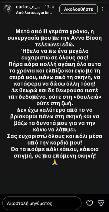 «Μετά από 11 γεμάτα χρόνια, η συνεργασία μου με την Άννα Βίσση τελειώνει εδώ.
