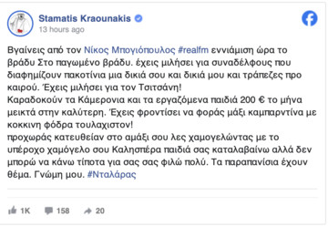 «Βγαίνεις από τον Νίκος Μπογιόπουλος #realfm εννιάμιση ώρα το βράδυ Στο παγωμένο βράδυ. έχεις μιλήσει για συναδέλφους που διαφημίζουν πακοτίνια μια δικιά σου και δικιά μου και τράπεζες προ καιρού. Έχεις μιλήσει για τον Τσιτσάνη! Καραδοκούν τα Κάμερονια και τα εργαζόμενα παιδιά 200 € το μήνα μεικτά στην καλύτερη.