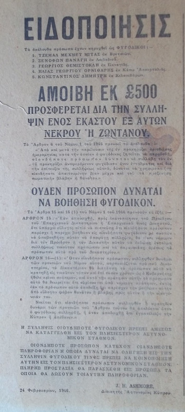 Στις 7 Οκτωβρίου 1945 ανακοινώνει ότι με δύναμη 225 στρατιωτών και αστυνομικών ξεκίνησε μεγάλη αποστολή σύλληψης του Μίτα στα βουνά της Πάφου. Από τους 225, οι 200 ήταν στρατιώτες και οι 25 αστυνομικοί.