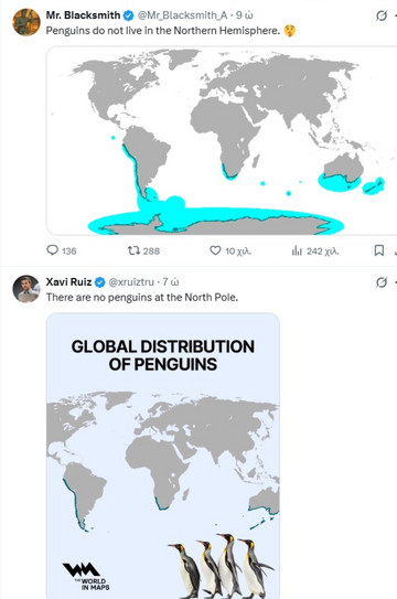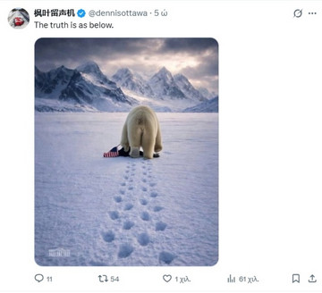 Σε αυτήν, διακρίνεται ο Ρεπουμπλικάνος πρόεδρος να βαδίζει προς μια οροσειρά γεμάτη πάγους όπου είναι καρφωμένη η σημαία της Γροιλανδίας. Μαζί του, ωστόσο, έχει κι έναν πιγκουίνο που κρατά τη σημαία των ΗΠΑ, ενώ την ανάρτηση συνοδεύει η φράση: «Αγκαλιάστε τον πιγκουίνο».