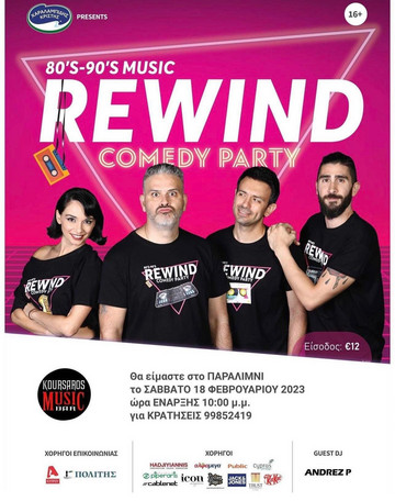 Ένα μοναδικό πάρτι, ένα πρωτοποριακό show που συνδυάζει μουσική και stand–up comedy σε ισόποσες δόσεις και παρασύρει το κοινό με νοσταλγικές στιγμές και μουσικές των 80’s και 90’s, απολαμβάνουμε με το “Rewind”.