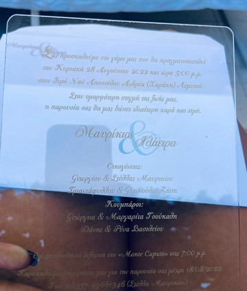 «Σας προσκαλούμε στον γάμο μας που θα πραγματοποιηθεί την Κυριακή 28 Αυγούστου και ώρα 17.00 στον Ιερό Ναό Αποστόλου Ανδρέα Λεμεσού. Στην ομορφότερη στιγμή της ζωής μας θα μας δώσει ιδιαίτερη χαρά και τιμή να είστε εκεί. Μαυρίκιος και Ιλάειρα»