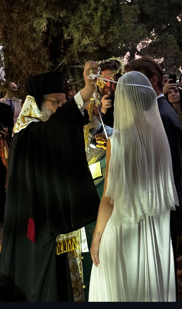Οι καλεσμένοι μεταφέρθηκαν με σκάφη στο πανέμορφο νησάκι, όπου τις τελευταίες μέρες έγιναν όλες οι προετοιμασίες για το μυστήριο. Την πρώτη φωτογραφία από τον γάμο «διέρρευσε» ο ξάδερφος του γαμπρού, Τεό Νιαρχος και σε αυτήν διακρίνεται το ζευγάρι την ώρα που ο ιερέας αλλάζει τα στέφανα.