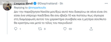 Η Δέσποινα Βανδή από τη μεριά της, ανταποκρίθηκε θετικά στα λεγόμενα του Νίκου Μπάρκουλη απαντώντας στο tweet του: “Δεν την παρεξήγησα Νικόλα μου!Εγώ αυτό που διακρίνω σε σένα είναι ότι είσαι ένα υπέροχο παιδί!Εκει θα σου έβαζα 10 και πιστεύω πως σίγουρα στη διαμόρφωση αυτού του χαρακτήρα συνέβαλε και η μητέρα σου!Αυτο θα κρατήσω και μετά το τέλος του παιγνιδιού!”
