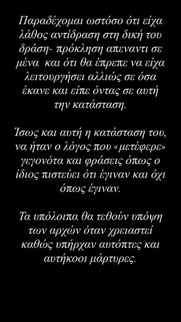 «Παραδέχομαι ωστόσο ότι είχα λάθος αντίδραση στη δική του δράση-πρόκληση απέναντι σε μένα και ότι θα έπρεπε να είχα λειτουργήσει αλλιώς σε όσα έκανε και είπε όντας σε αυτή την κατάσταση. Ίσως και αυτή η κατάστασή του να ήταν ο λόγος που “μετέφερε” γεγονότα και φράσεις όπως ο ίδιος πιστεύει ότι έγιναν και όχι όπως έγιναν. Τα υπόλοιπα θα τεθούν υπόψη των αρχών, όταν χρειαστεί, καθώς υπήρχαν αυτόπτες και αυτήκοι μάρτυρες», έγραψε ο Νίκος Παππάς.