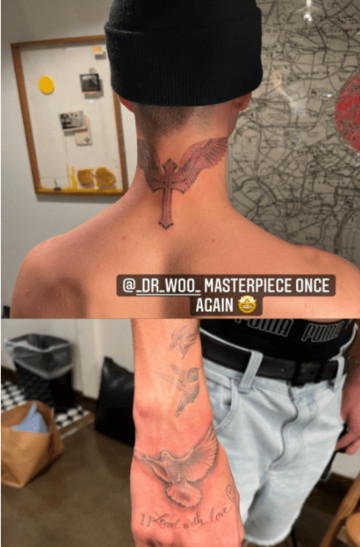 Πρόσθεσε ένα νέο σχέδιο στην tattoo συλλογή του, επιλέγοντας ένα τατουάζ σε σχήμα σταυρού με ένα ζευγάρι φτερά αγγέλου στο πίσω μέρος του λαιμού του.