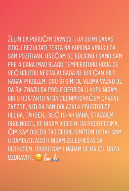 Θέλω να πω στο κοινό πως έλαβα τα αποτελέσματα του τεστ κορωνοϊού σήμερα και είμαι θετικός… Νιώθω πολύ καλά και είχα ήπιο πυρετό πριν από τέσσερις ημέρες ο οποίος εξαφανίστηκε το πρωί. Δεν νιώθω περίεργα τώρα, είμαι καλά. Αυτό που είναι πολύ σημαντικό για εμένα είναι ότι όλοι γνωρίζουν πως μετά το ντέρμπι (σ.σ με την Παρτιζάν) στο κύπελλο δεν ήρθα σε επαφή με κανένα παίκτη του Ερυθρού Αστέρα, ούτε πήγα στις εγκαταστάσεις της ομάδας. Επίσης για περίπου δέκα ημέρες λόγω της κατάστασης δεν έχω δει ούτε τους γονείς μου. Μόλις ένιωσα το πρώτο σύμπτωμα παρέμεινα στην απομόνωση και δεν ήθελα τίποτε άλλο από το να περάσει γρήγορα όλο αυτό