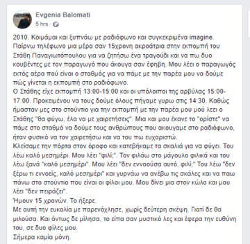 «2010. Κοιμάμαι και ξυπνάω με ραδιόφωνο και συγκεκριμένα imagine. Παίρνω τηλέφωνο μια μέρα σαν 15χρονη ακροάτρια στην εκπομπή του Στάθη Παναγιωτόπουλου για να ζητήσω ένα τραγούδι και να πω δυο κουβέντες με τον παραγωγό που άκουγα σαν έφηβη. Μου λέει ο παραγωγός εκτός αέρα πού είναι ο σταθμός για να πάμε με την παρέα μου να δούμε πώς γίνεται η εκπομπή στο ραδιόφωνο.