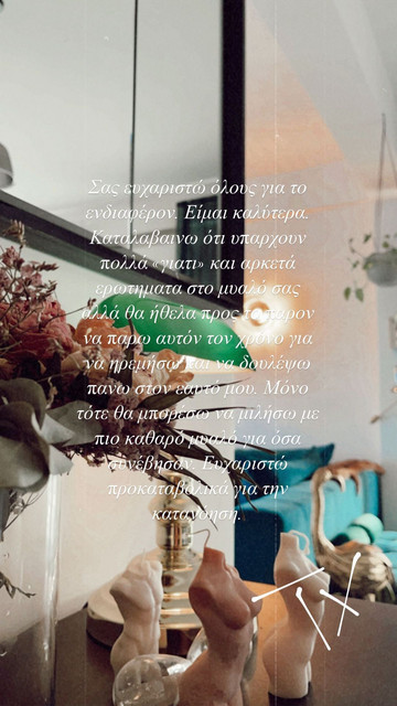 “Σας ευχαριστώ όλους για το ενδιαφέρον. Είμαι καλύτερα. Καταλαβαίνω ότι υπάρχουν πολλά “γιατί” και αρκετά ερωτήματα στο μυαλό σας αλλά θα ήθελα προς το παρόν να πάρω αυτό τον χρόνο για να ηρεμήσω και να δουλέψω πάνω στον εαυτό μου. Μόνο τότε θα μπορέσω να μιλήσω με πιο καθαρό μυαλό για όσα συνέβησαν. Ευχαριστώ προκαταβολικά για την κατανόηση”