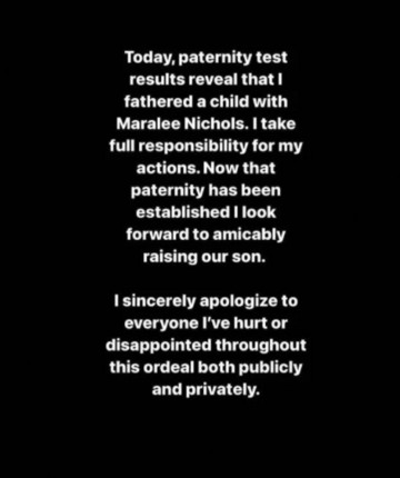 Τη Δευτέρα, ο παίκτης του NBA μοιράστηκε ένα μήνυμα στο Instagram Story του, γράφοντας: «Σήμερα, τα αποτελέσματα του τεστ πατρότητας αποκαλύπτουν ότι έκανα παιδί με τη Maralee Nichols. Αναλαμβάνω την πλήρη ευθύνη για τις πράξεις μου. Τώρα που η πατρότητα έχει καθιερωθεί, ανυπομονώ να μεγαλώσουμε φιλικά τον γιο μας».