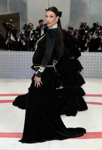 Όσο για την Κάρλι Κλος, το διάσημο μοντέλο επέλεξε ένα μακρύ εφαρμοστό φόρεμα από το οίκο Loewe, με την φουσκωμένη της κοιλίτσα να είναι εμφανής.