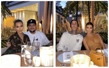 H ιδρύτρια του “Skims” κοινοποίησε δύο φωτογραφίες – μία της Kourtney Kardashian και του φίλου της Travis Barker και μία από της Khloé Kardashian που χαμογελούσε δίπλα στον Rob- ενώ έγραψε: «Δείπνο με τα αγαπημένα μου ζευγάρια».