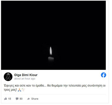 «Έφυγες και ούτε καν το έμαθα… θα θυμάμαι την τελευταία μας συνάντηση οι τρεις μας», έγραψε η Όλγα Κιουρτσάκη δημοσιεύοντας μαύρο στιγμιότυπο με ένα κερί.