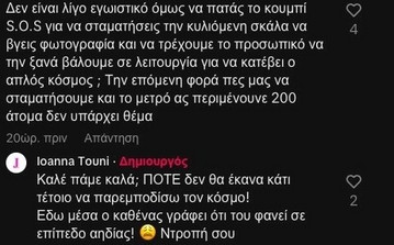 “Δεν είναι λίγο εγωιστικό όμως να πατάς το κουμπί S.O.S για να σταματήσεις την κυλιόμενη σκάλα να βγεις φωτογραφία και να τρέχουμε το προσωπικό να την ξανά βάλουμε σε λειτουργία για να κατέβει ο απλός κόσμος; Την επόμενη φορά πες μας να σταματήσουμε και το μετρό ας περιμένουνε 200 άτομα δεν υπάρχει θέμα”.