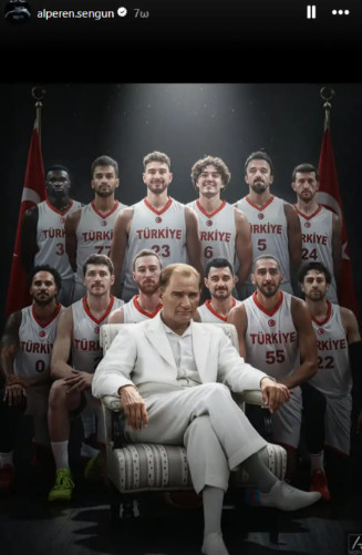 Αρχικά, ανάρτησε μια AI φωτογραφία που δείχνει τον Κεμάλ σε μια καρέκλα και πίσω του όλους τους παίκτες της εθνικής ομάδας μπάσκετ της Τουρκίας.