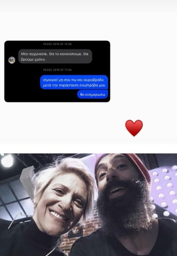 Ανάμεσα στους συναδέλφους της και ο Κύπριος ηθοποιός, Παναγιώτης Κυριάκου, ο οποίος ανέβασε μια φωτογραφία μαζί της με μια κόκκινη καρδιά αλλά και μια συνομιλία του στο Messenger, στην οποία φαίνεται ότι έψαχναν χρόνο για να τα πουν από κοντά