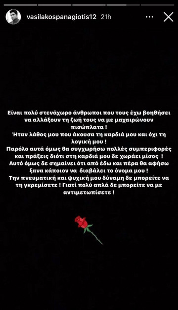 Ξέσπασε μέσω του προσωπικού του λογαριασμού στο Instagram ο Παναγιώτης Βασιλάκος. Ο πρώτος Έλληνας Bachelor έκανε μια ανάρτηση όλο νόημα εναντίον εκείνων που διαβάλλουν το όνομά του. Μάλιστα, ο ίδιος έκανε λόγο για άτομα που τα βοήθησε και μετά στράφηκαν εναντίον του. Το μήνυμα ωστόσο ήταν σαφές πως είχε άρωμα «The Bachelor», καθώς το συνόδευσε με ένα κόκκινο τριαντάφυλλο.