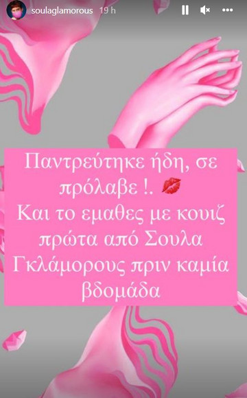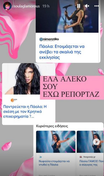 Συγκεκριμένα, η “Soulas Glamorous” ανέβασε ειδήσεις από διάφορα sites που ανέφεραν ότι η Πάολα θα ανέβει τα σκάλια της εκκλησίας και στο επόμενο story έγραψε “Παντρεύτηκε ήδη, σε πρόλαβε! Και το έμαθες με κουίζ πρώτα από Σούλα Γκλάμουρους πριν καμία εβδομάδα”.