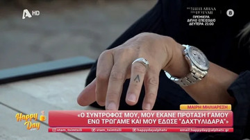 Η ίδια συνέχισε λέγοντας: «Όταν μου έκανε την πρόταση, είχαμε πάει να φάμε σε ένα αγαπημένο μαγαζάκι στη Γλυφάδα. Στα καλά καθούμενα, εκεί που μιλούσαμε και τρώγαμε, σκύβει και μου λέει “θες να με παντρευτείς;”…Με δαχτυλιδάρα».