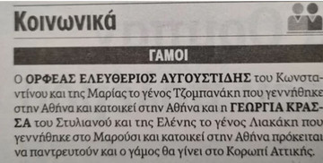Συγκεκριμένα η αγγελία γράφει: «Ο Ορφέας Ελευθέριος Αυγουστίδης του Κωνσταντίνου και της Μαρίας το γένος Τζομπανάκη που γεννήθηκε στην Αθήνα και κατοικεί στην Αθήνα και η Γεωργία Κρασσά του Στυλιανού και της Ελένης το γένος Λιακάκη που γεννήθηκε στο Μαρούσι και κατοικεί στην Αθήνα πρόκειται να παντρευτούν και ο γάμος θα γίνει στο Κορωπί της Αττικής».